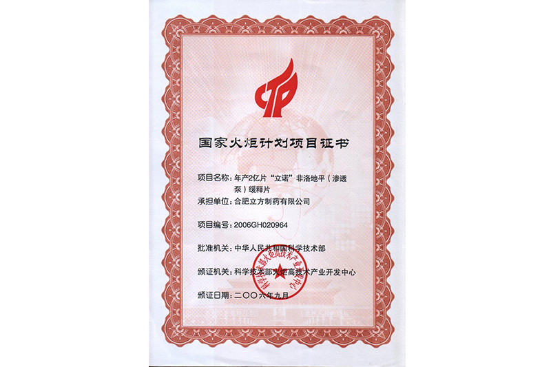 國家火炬計劃項目證書